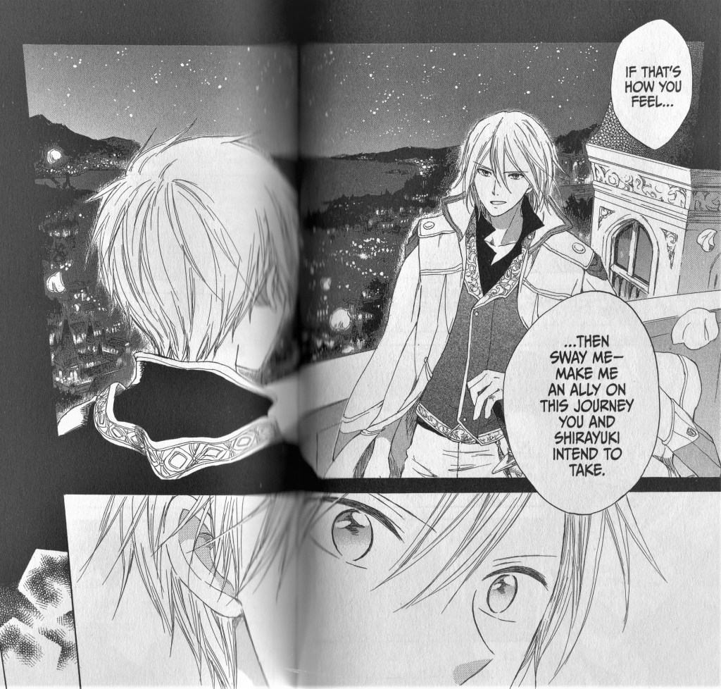 Zen and Shirayuki’s relationship becomes solidified in this volume as well. Zen professes his devotion to her, and tells her that in his own time he will find a way to tell the world about their relationship. I think one of the most important moments is when Zen stands up to his brother Izana and we see that Izana comes close to accepting their relationship. He basically challenges Zen to convince him that Shirayuki would make a good bride for him. I think it’s very likely he’ll be successful, but in the meantime Izana will definitely continue to challenge and test Shirayuki on her fitness to be part of the noble family.