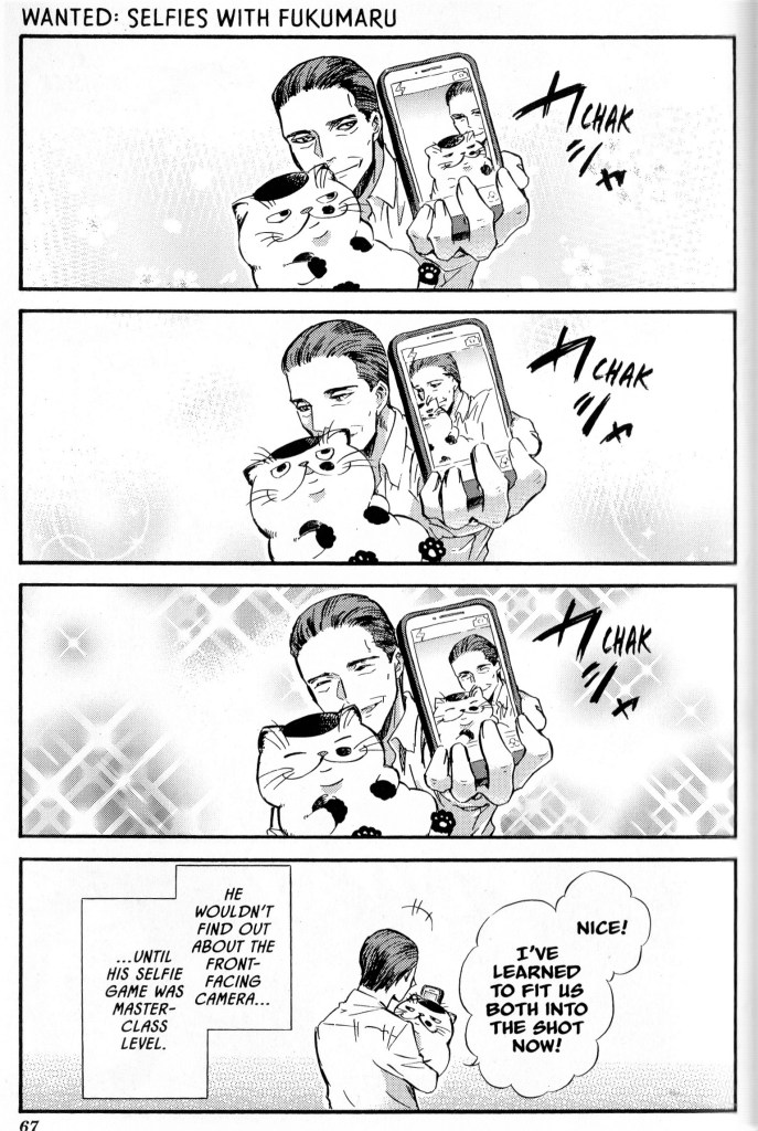 As a cat parent myself, I really enjoyed the short comics about cat behavior. There’s a part of one chapter where Fukumaru decides he likes the box his new bed came in more than his new bed which is a classic cat problem. There’s also a couple of chapters on Fukumaru and his litter box. I literally have to sweep my floors every morning just to get all the cat litter off of it from our cat’s digging and tracking it through the apartment, so it was definitely funny seeing Kanda try and deal with Fukumaru’s litter problems. There’s also Fukumaru laying on the laundry, Kanda taking selfies with him, having to sleep in weird positions. I really do think everything in this manga is very relatable and true to what it’s like to own a cat.
