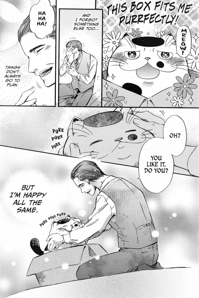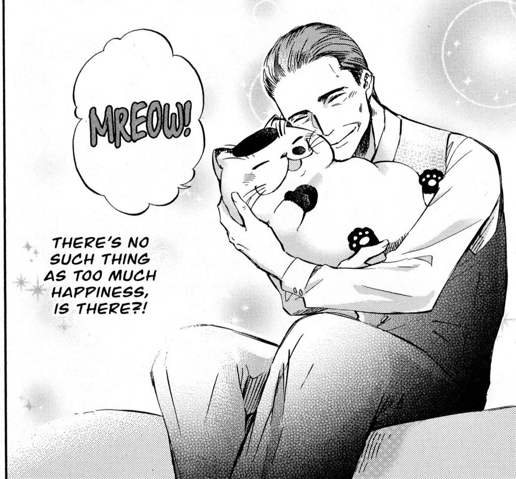 If you’re also like me and see the art as an essential part of any manga, I think you’ll be satisfied with A Man and His Cat. Umi Sakurai has a nice style in the line work, character designs, and page layouts that gives this series a nice visual appeal. I love how Sakurai created this contrast of styles between Kanda and Fukumaru. Where Kanda is drawn as this very handsome man, with his slicked back hair and neat suit, Fukumaru is this chubby, smooshed nose cat who I think most people wouldn’t see as conventionally cute. Seeing them together, side-by-side, creates this comedy of contrast out of the expectation that a man this stylish and put together would choose a cat that goofy looking. It becomes one of the backbones of the series, with side characters often wondering why he chose Fukumaru as well.