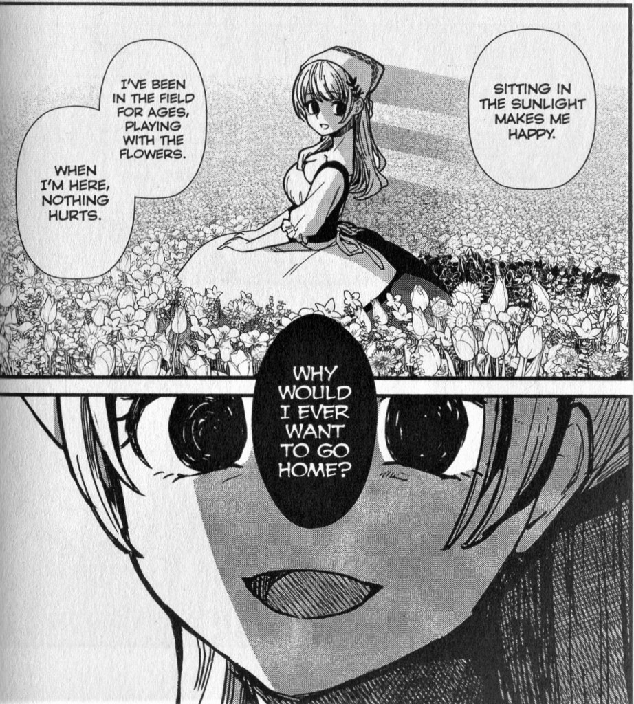 I didn’t notice anything in the art or panel design that specifically stood out to me as especially eye-catching. However, I did like the tone/mood change from chapter one to chapter two. We move from a story centered around two characters coming to understand one another to a dangerous mystery, that leads to a poisonous field of flowers. In chapter two we see a great combination of story and art as Shiraishi and Nanao take on the task of telling a darker story. I like how the more carefree atmosphere gives way to a darker tone, especially with the character designs and expressions of the people she encounters. It really does emit an atmosphere of danger and mystery. The girl she meets in the field is especially well done as her expressions shift from pleasant to crazed from page to page.