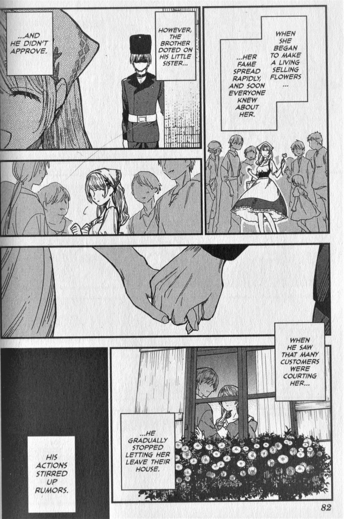 The story itself is kind of weird but it does add a nice break from the slice-of-life nature of the rest of the chapters. It centers around a brother and sister pair who settled in the city to sell flowers to tourists. But one day she got drawn to the cursed field and never came back. Elaina happens upon her on her way into the city, offering her a bouquet of the flowers to deliver to someone in town. The plot progresses as we learn more about the city, the flowers, and the brother and sister. It morphs into a kind-of jealousy-filly incestuous pairing, where the brother is revealed to be very possessive of his sister to the point of seeming to be in love with her. This whole dynamic was pretty awkward, but I did like the plot where the field of flowers pretty much acts like a Venus fly-trap for humans who don’t have magic. It turns into a pretty tragic tale, but in the end, it kind of feels like the brother got what he deserved. Though I feel bad for the sister.