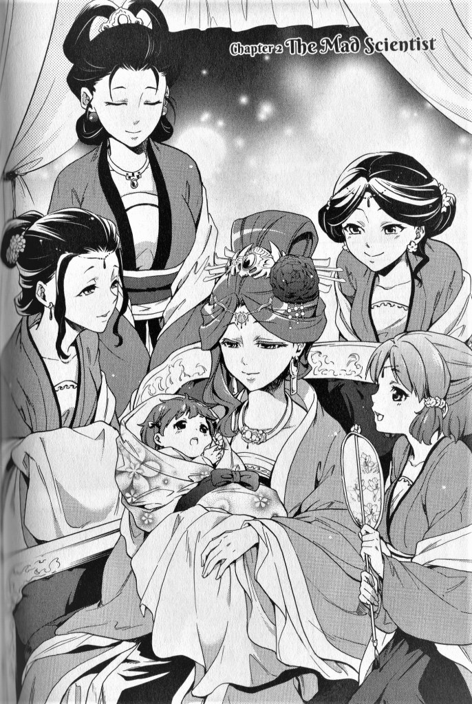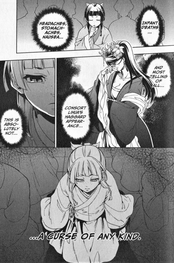 Medical mysteries play a big part in this series, and every chapter has something going on that Maomao has to figure out. The first big mystery that exposes Maomao to those above her is when the imperial heirs begin to come down with what many think is a curse. She quickly recognizes the symptoms as those of poisoning and tries to discreetly warn the mothers. I love how the particulars of these diseases and poisoning cases are spelled out very clearly by Maomao, and the story goes into how she figures it out and the kinds of cures she makes to combat them. Some of the mysteries are very interesting, and I love seeing Maomao’s thought process as she tries to piece together what is happening.