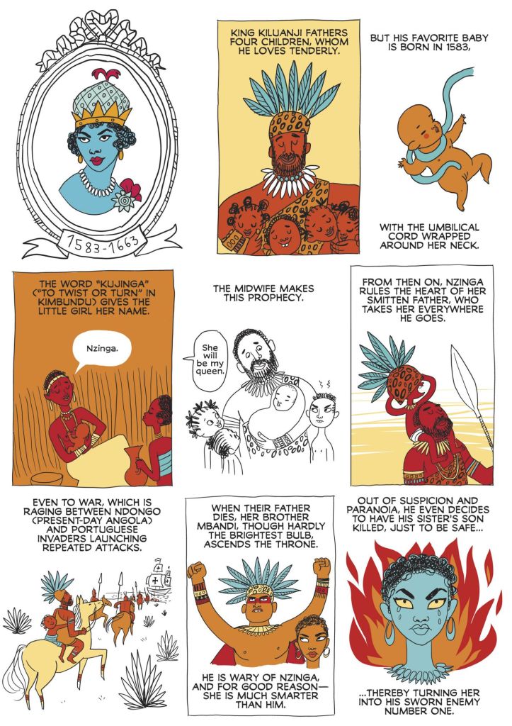 I was very impressed with Bagieu’s ability to condense so many histories into a few pages of panels. A whole lifetime of accomplishments is hard to simplify into a few simple pages, but she manages to do it in a way that conveys that woman’s accomplishments in a meaningful and concise way. I also loved seeing her highlight some lesser known women that don’t get enough spotlight, especially indigenous women and women of color. One of my favorite stories was the history of Nzinga, the Queen of Ndongo and Matamba. She was never someone I had ever heard about, probably for typical Euro-centric reasons concerning the modern US education system, so I loved seeing an emphasis on strong women leaders in their community who fought passionately for their people.