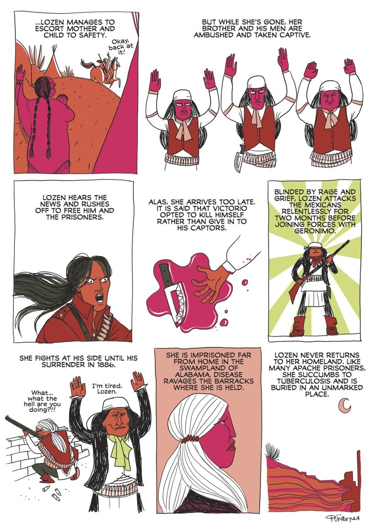 Similarly, there was Lozen, an Apache woman who became a powerful leader and warrior fighting against colonist rule. I love seeing stories about the American indigenous peoples, and here we see one of their more skilled fighters and leaders, a shaman, and an ally of Geronimo. Bagieu chooses to highlight an interesting story from her history, one where in the midst of battle, she helps a pregnant woman give birth and escorts her three days to safety. Along the journey she has to use stealth and her myriad of skills to travel undetected. She eventually gets them to safety, and then heads back into battle, eventually joining Geronimo two months later. It’s a very inspiring story of the kind of strength and resourcefulness women can have faced with life threatening situations.