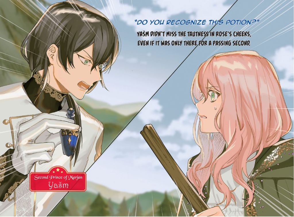 I think some of the biggest developments for Rose come in the form of discovering intimacy with Harij and how life at his mansion begins to increase her self-confidence. I would say that Harij is an ideal love interest. He’s supportive, allows her to continue to go out to her hut in the forest to make potions, knows she is fine with the simpler things in life but still loves to spoil her anyways. In the course of trying to increase their intimacy, we see just how patient he is with her. He doesn’t push, but he does make it known that he would like to be more physical with her, allowing Rose to choose the how and the when. In this way, I think we see just how much he cares for her. It’s the quality of the respect and patience he has with her that I think tells so much about how he sees her.
