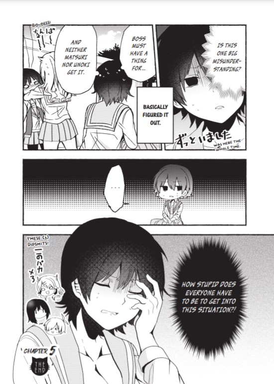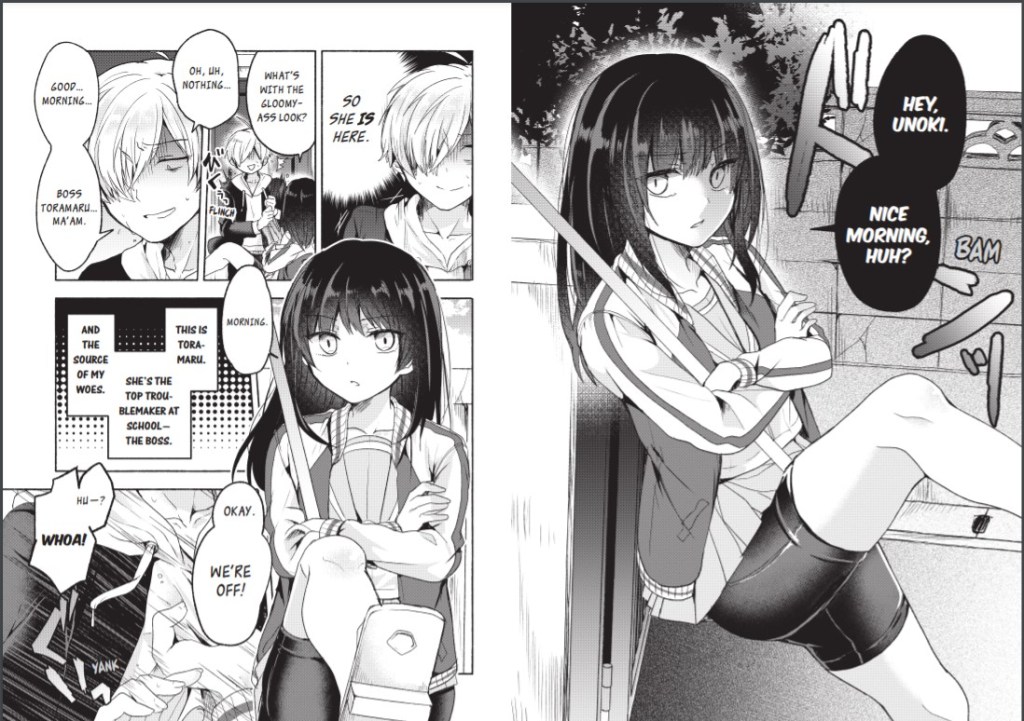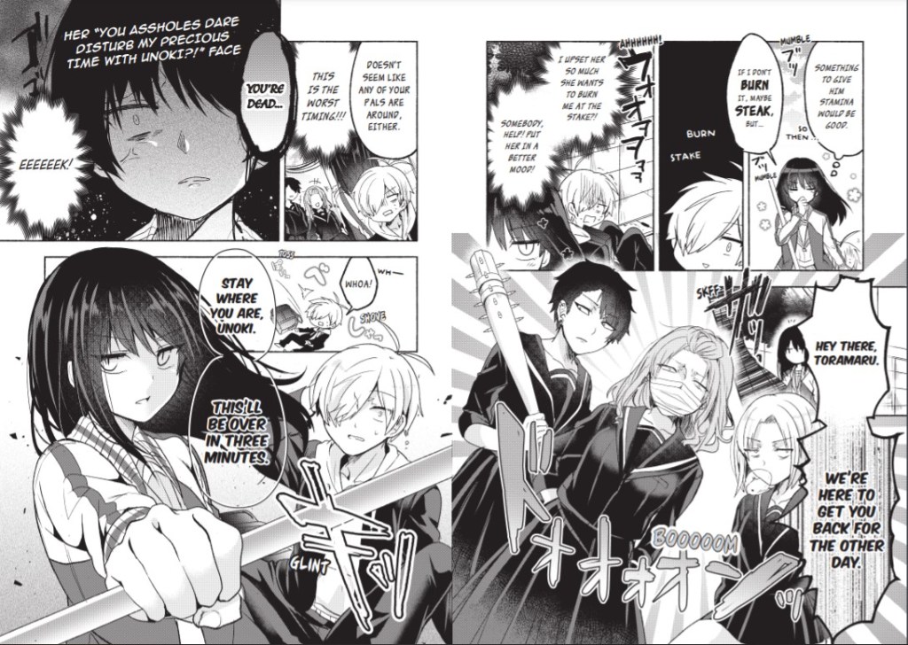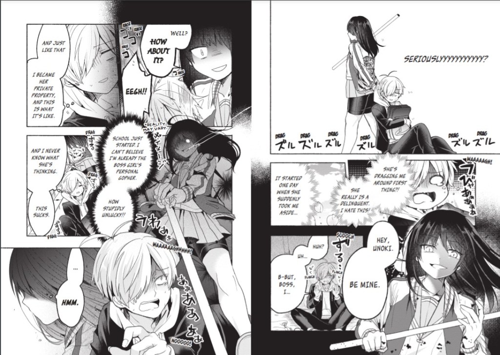 Unoki is a guy that has been bullied a lot, and you can tell, not just by him saying he has, but by his actions and thought processes. He truly believes that he is Toramaru’s gopher through the majority of the first volume. I think most of that comes from a very low self-opinion and self-confidence. He takes some sort of messed-up pride in his ability to cater to others, but in a way High School is a messed-up place and can create messed-up people. Unoki just happens to be one of those victims. But the great thing about his relationship with Toramaru is that she sees a kind of strength and kindness in him that maybe she has been needing in her life. In that way, I think Toramaru nurtures Unoki’s self-confidence a bit, in her own backwards way, but it seems to work. And I think it may become one of the strong points of this series, seeing how Unoki grows while he’s with her.