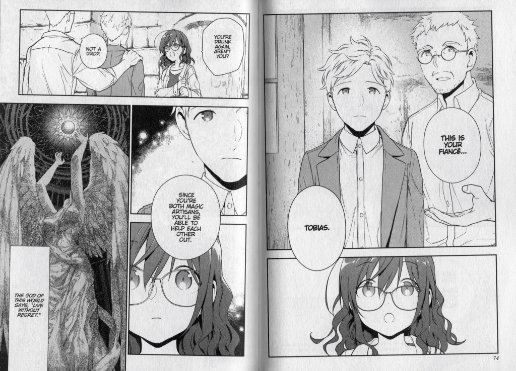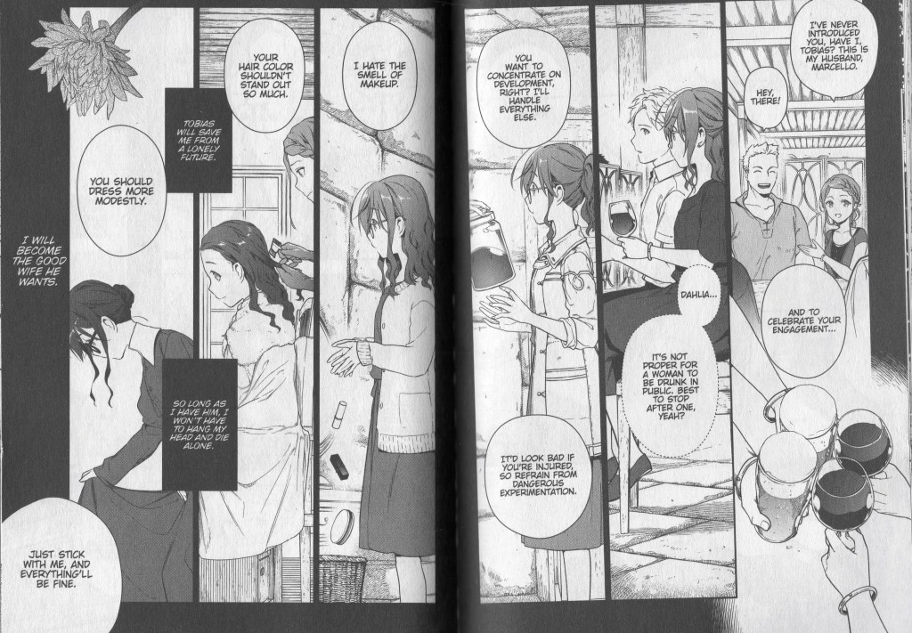 The one complaint I have about this volume is that the plot felt a little rushed. However, it tends to happen a lot with first volumes as they set up the world and story, trying to bring readers up to speed before getting into the meat of the story that the author actually wants to tell. We see this here as we quickly transition from her childhood learning under her father in one chapter, to meeting her father’s apprentice, to her first big invention, to her engagement to the apprentice, to their breakup, and then finally the construction of her business and the meeting of what I believe to be the next love interest. It’s a very fast-paced first volume, but all the background is there to suck me in and make me itch to read the next one.