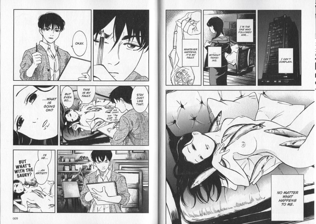 Besides the art that really drew me in to this one, Hamada has crafted a really cute story between a quirky abstract artist who’s a bit of a tsundere and a spacey office worker who really seems to love fish. The story starts off on a bit of a dark note with Emiko contemplating her own suicide as she walks back home from work, but she stumbles upon Shunsui on the way, and before you know it, she’s sucked in to being his nude model in exchange for money and cooked fish after. It really is weird to see her all nude with fish just laid across her body in weird ways, and then they go and eat the fish after?! We see a little bit how this process translates into his actual art later, but it’s definitely bizarre in the manga. It’s honestly one of the main reasons I like it, and it kind of adds to the character of Shunsui throughout the whole volume.